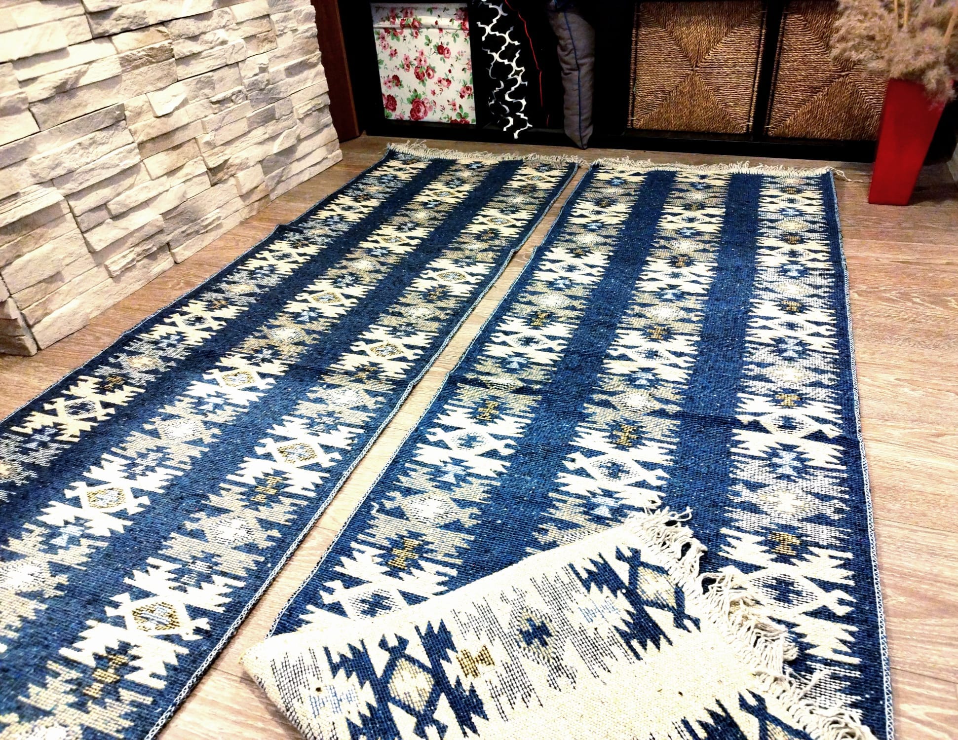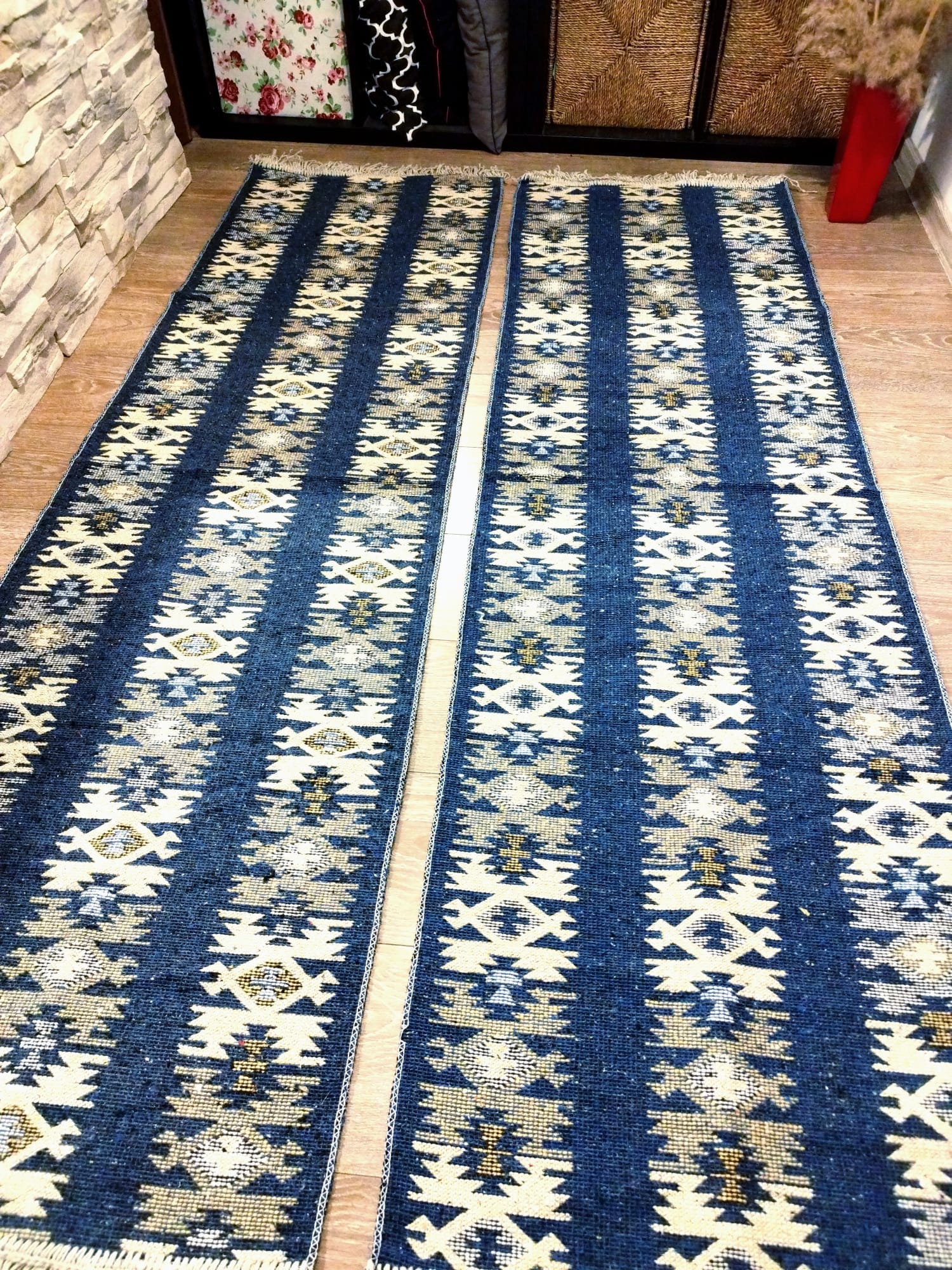 1+1 Covoare traditionale, dimensiunea 60x200cm, Albastru si crem, model Rustic