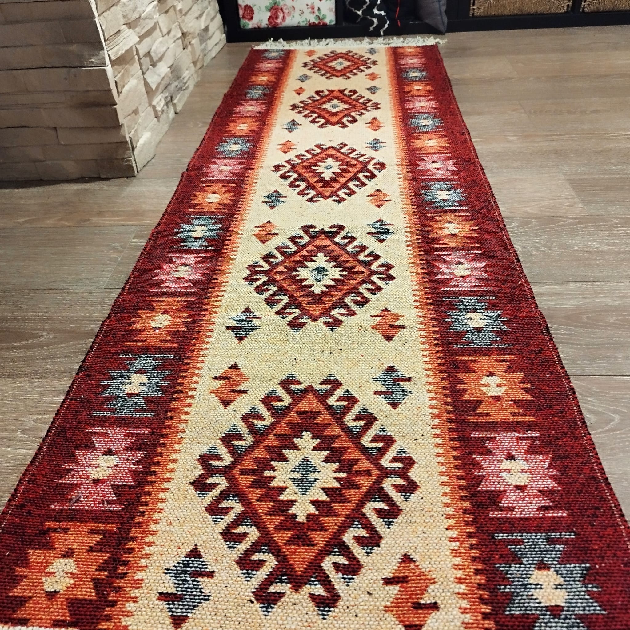 1+1 Covoare traditionale, cu doua fete, dimensiunea 60x180cm, rosu si crem, model ROMB