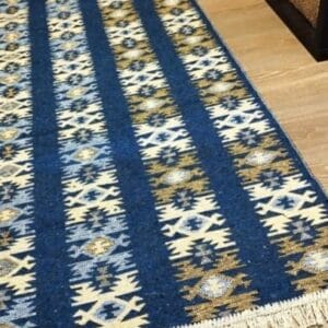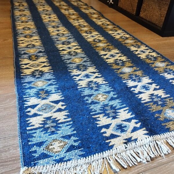 Covor traditional, dimensiunea 80x300cm, albastru si crem, model Rustic